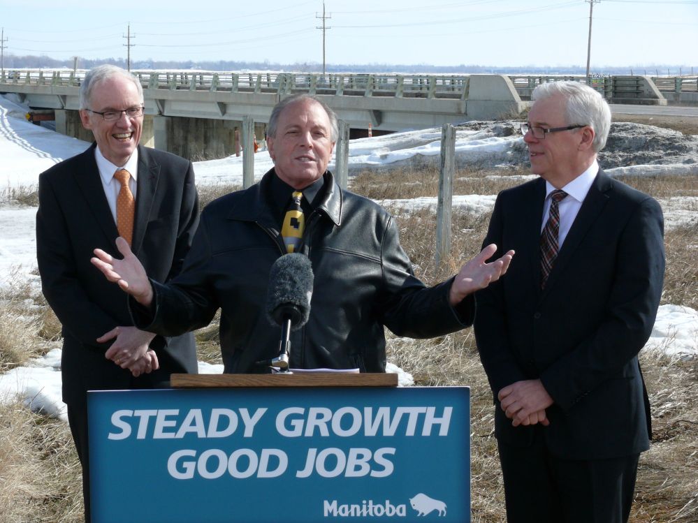Premier Greg Selinger was in Steinbach and at the Seine River Diversion Tuesday morning to announce Highway 12 upgrades within the city and give more details on the Highway 12 work being done this summer between Ste Anne and Steinbach, as well as the paving of Road 302 north of Richer.