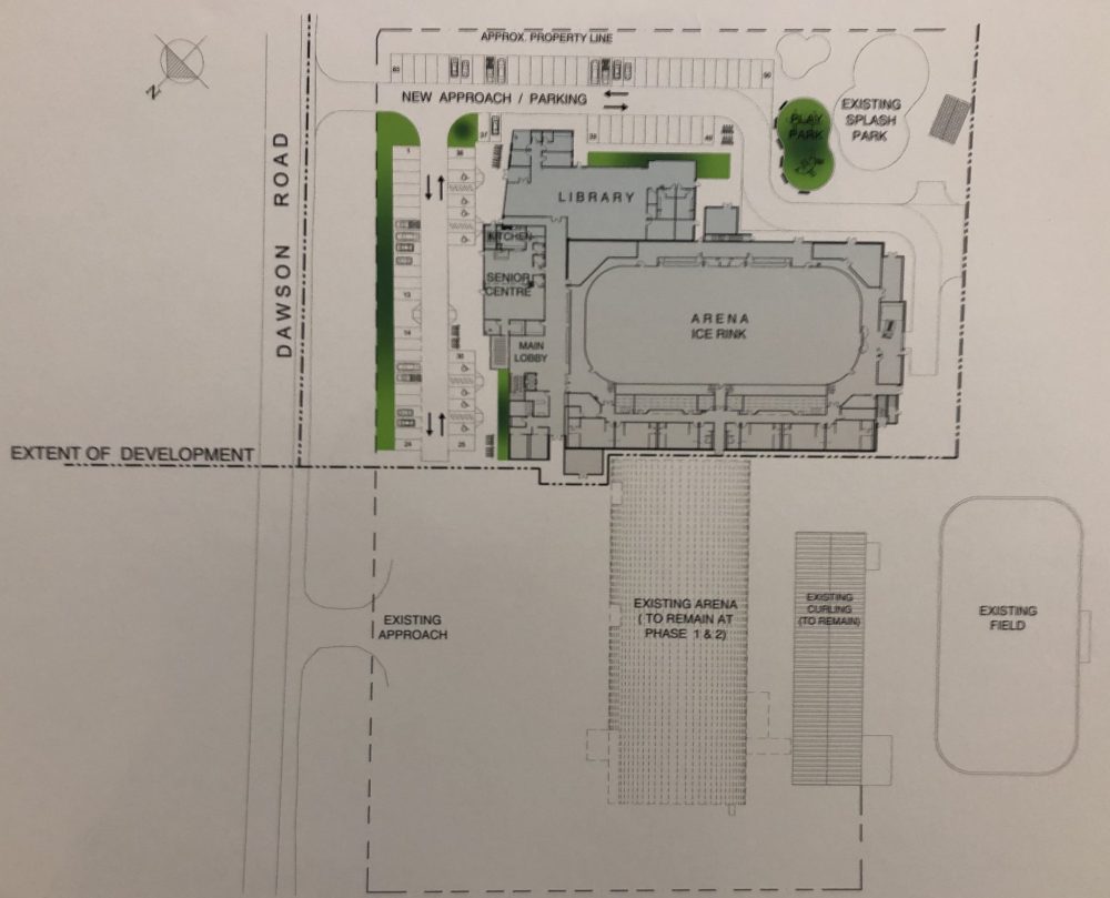 GREG VANDERMEULEN THE CARILLON A site plan shows the new facility, planned for the southeast side of the current arena. While the existing arena will be removed the curling club will remain.