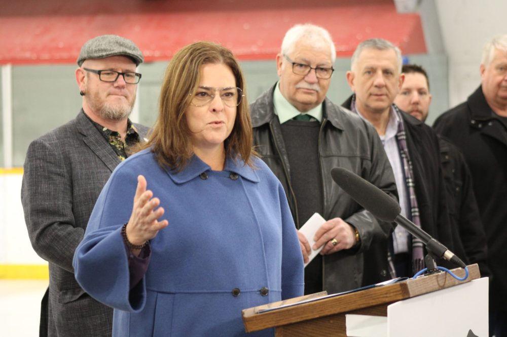 Premier Heather Stefanson makes the funding announcement in Lorette as Dawson Trail MLA Bob Lagasse, RM of Tache Mayor Armand Poirier and Provencher MP Ted Falk look on.