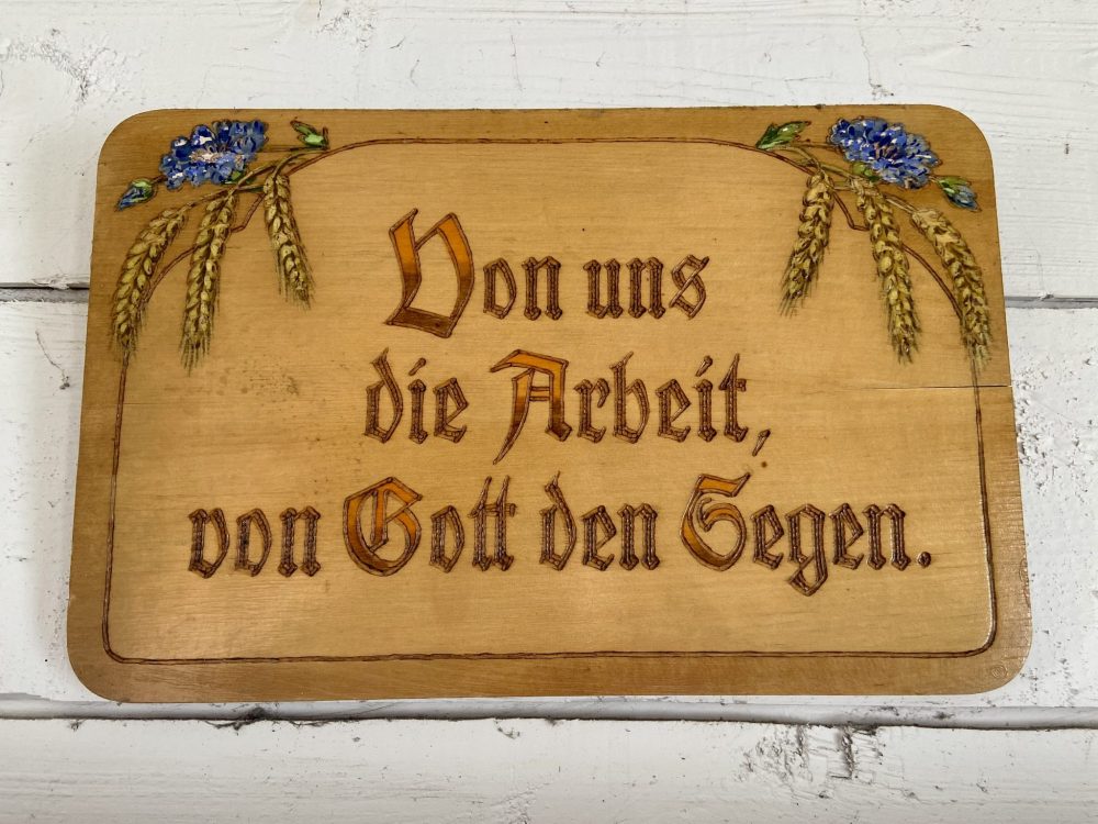 Another favourite activity for Tina is to work in the summer kitchen. She enjoys connecting with the tourists about how it was back then. Eventually, someone will ask what one of the signs in the summer kitchen means: ‘Von uns die Arbeit, von Gott den Segen.’ From German she translates it to ‘From us the work, from God the blessing.’ Which then naturally leads to a discussion about the Mennonite value of work and trusting God.