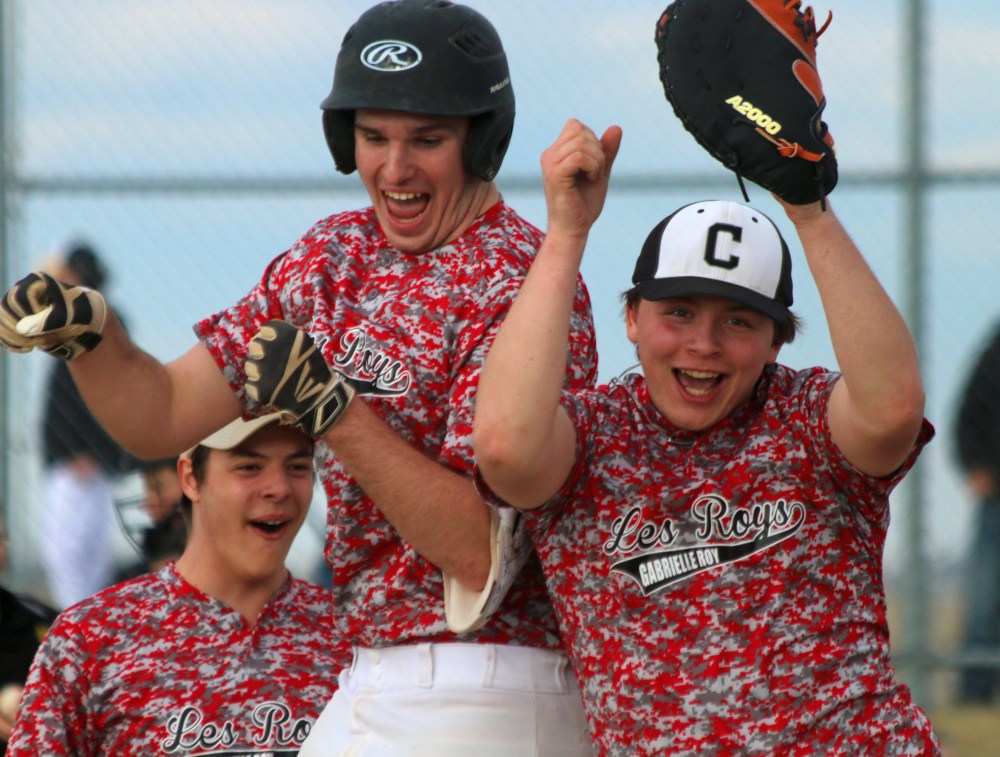 Josh Bartlett (black helmet) celebrates with teammates following his walk-off home run during Gabrielle-Roy's opening baseball game of the Zone 13 season. (Cassidy Dankochik The Carillon)