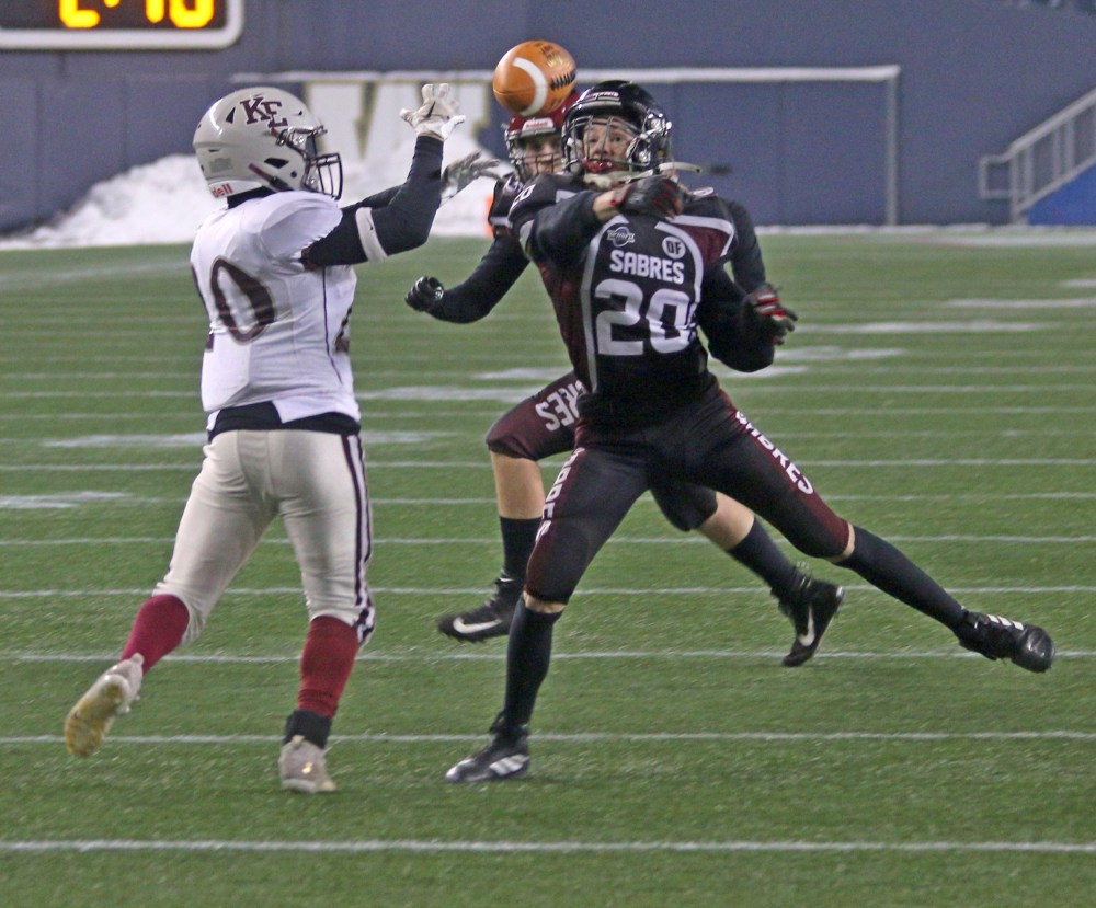 The game was flipped in the first quarter on special teams. With neither team generating much offense, Springfield managed to block a punt inside the Kildonan red zone, and promptly scored on the ensuing drive. The Sabres used their first downfield pass of the game to great effect, with Greason Pats connecting with tight end Brayden Allen for a wide open touchdown.