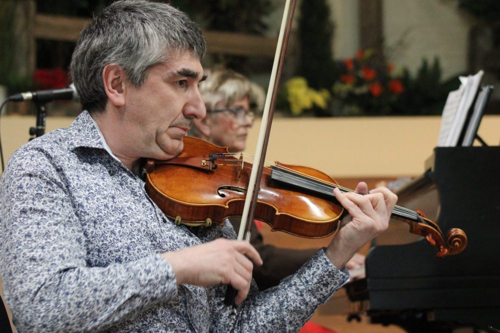 Oleg Pohkanovski of the Borealis Piano Trio plays Primavera-Spring by Astor Piazzolla, while behind him Judith Kehler-Siebert tickles the ivories. Minna Rose Chung rounded out the trio with her cello performance. Formerly called the Desautels Piano Trio, the group is made up of professors at the University of Manitoba’s Desautels Faculty of Music. This concert, hosted at Grace Mennonite Church, capped off this year’s Steinbach Arts Council concert series.
