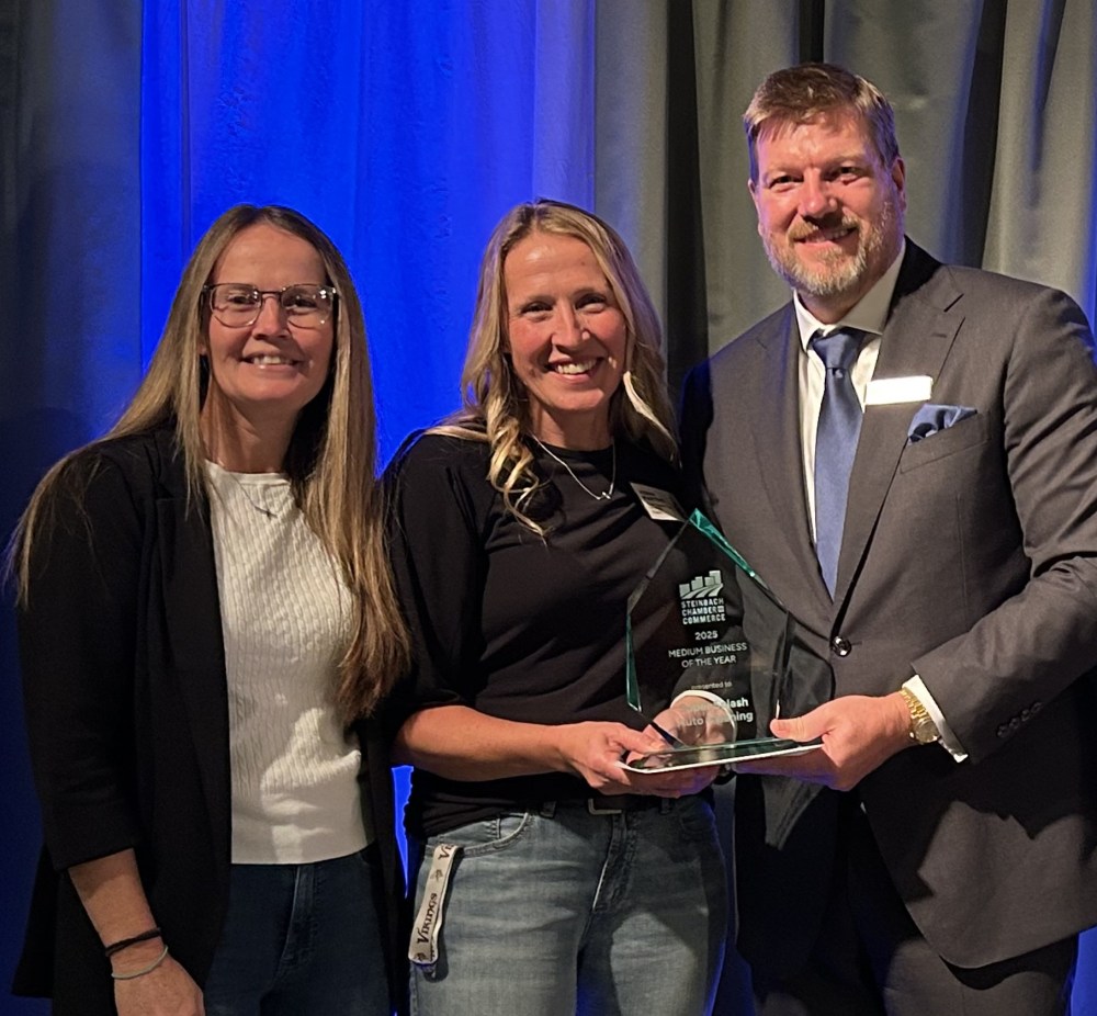 Left, Stella Unrau and Verna Martens accept the medium business award on behalf of Super Splash Auto Cleaning from Curtis Wennberg of Steinbach Credit Union.