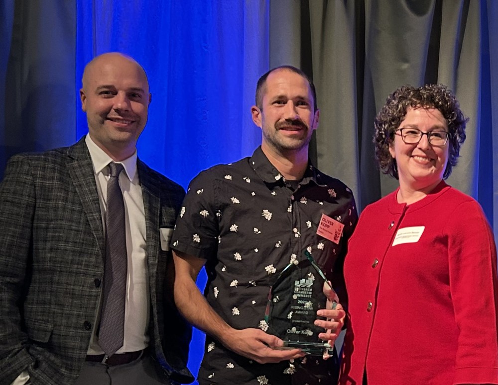 The future leader award which recognizes an individual between 18 and 40 who demonstrates admirable leadership and vision, was presented to Oliver Kopp of The Rental House. Other nominees included Melissa Funk from Lynn & Liana Designs, Allen Penner from Alto Creative and Megan Dueck of Old Church Bakery.
