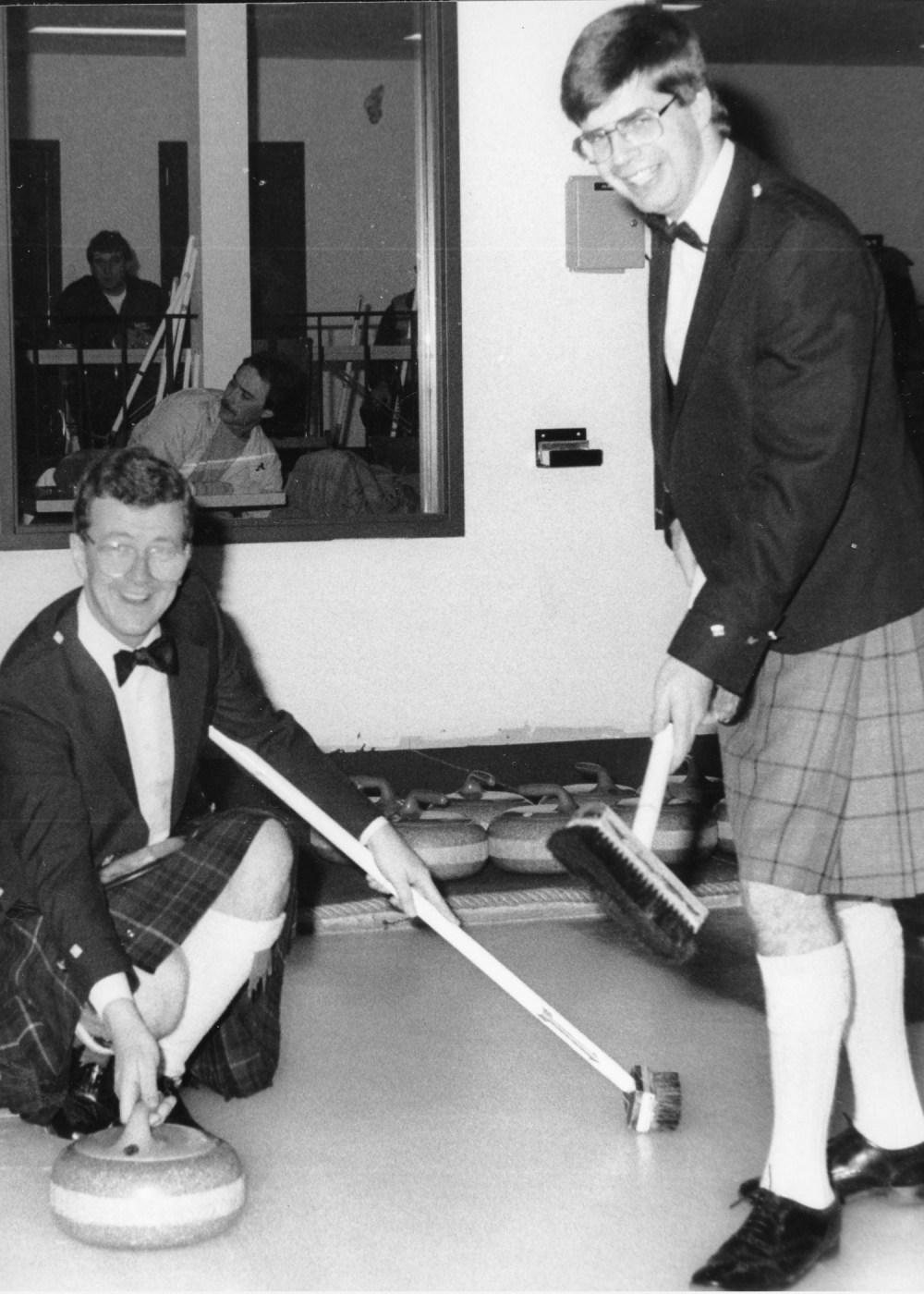Les When do we eat? Kletke from Radio Southern Manitoba was busy explaining the finer points of the game to Rob Is this a broom or a brush? Mitchell of CKWG. The media foursome was in trouble before we even got on the ice.