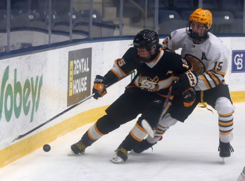 Jager Bueckert battles with a Garden City player during Winnipeg High School Hockey League action in Steinbach Jan. 14. The SRSS Sabres are fourth in the league standings. (Cassidy Dankochik The Carillon)