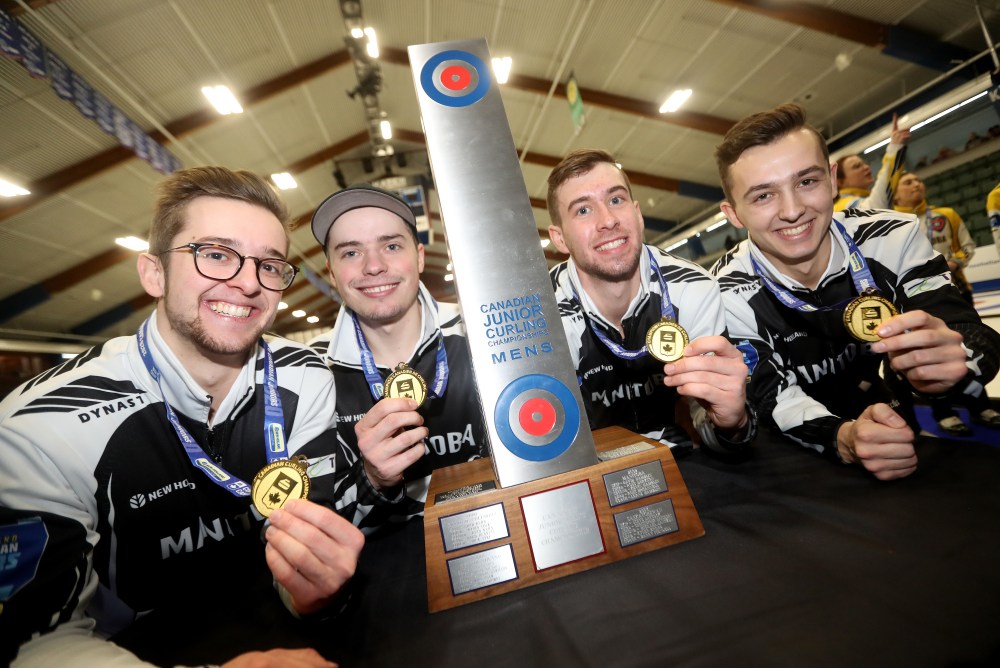 Jordan Peters (middle-left), helped Manitoba defeat Newfoundland to win the Canadian Junior Curling Championships in 2020. (TREVOR HAGAN / WINNIPEG FREE PRESS)