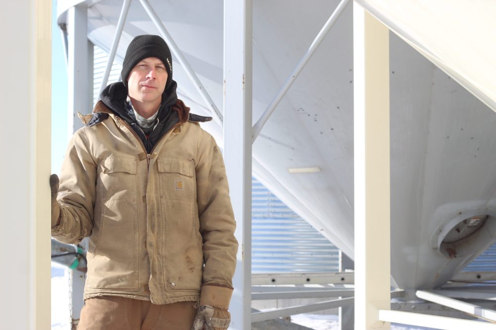 Randolph canola grower Jason Rempel stands by his silos on Jan. 19. Rempel welcomes the drop in Chinese canola tariffs, but still hopes to see the levies removed completely.