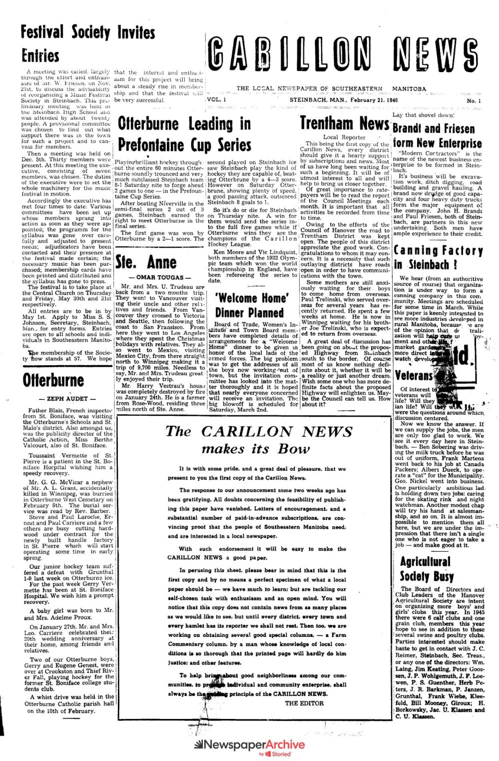 The response to our announcement some two weeks ago has been gratifying. All doubts concerning the feasibility of publishing this paper have vanished. Letters of encouragement, and a substantial number of paid-in-advance subscriptions, are convincing proof that the people of Southeastern Manitoba need, and are interested in a local newspaper.