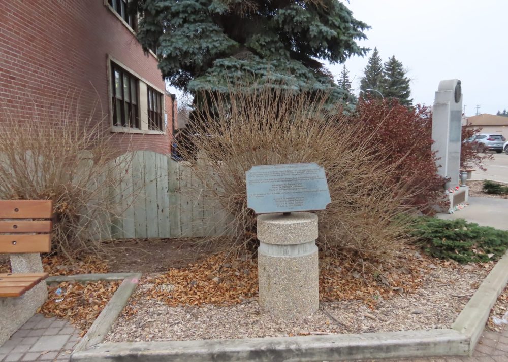 A plaque on a concrete pedastal reads: “This park is in honour of our father Frank F. Reimer who was a Steinbach merchant and entrepreneur known as “Carload Frank”. H