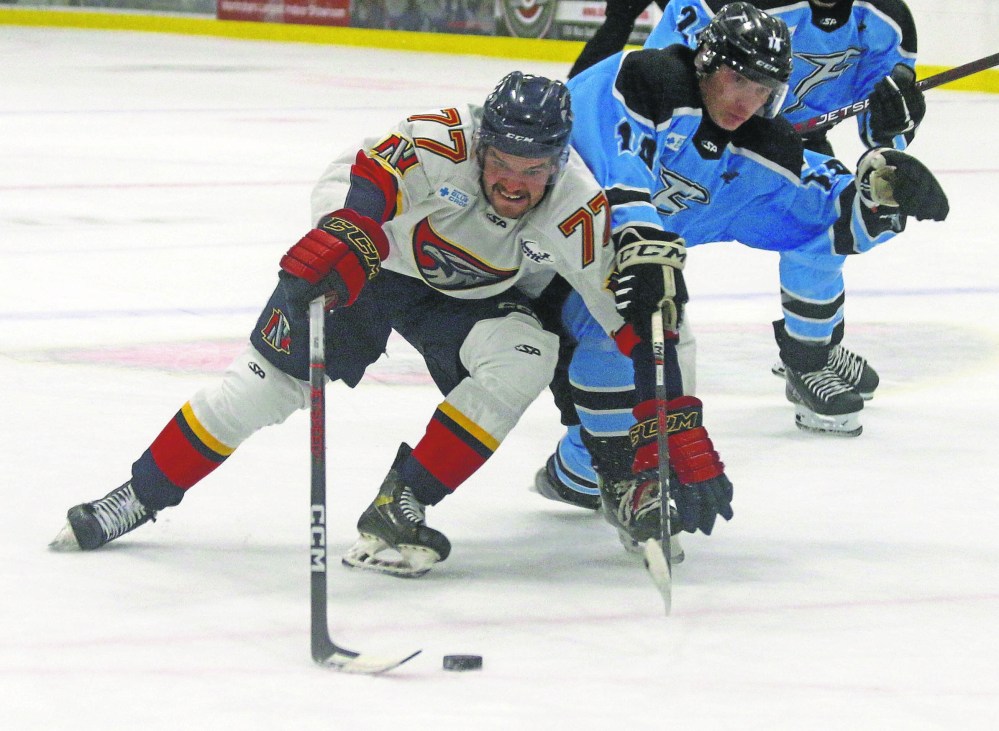 Bryce Warkentine battles for position in Niverville’s 4-1 victory over the Winnipeg Freeze in September of 2024.