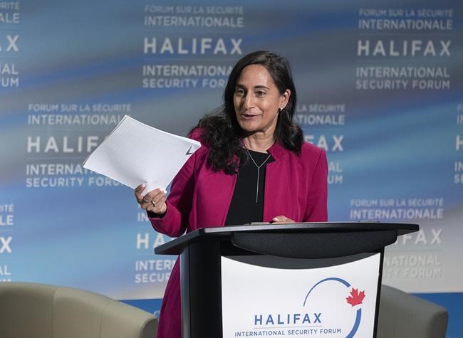 Defence Minister Anita Anand addresses the opening session of the Halifax International Security Forum, in Halifax, Friday, Nov. 19, 2021. Anand says the military's sexual misconduct crisis is hurting recruitment and morale. THE CANADIAN PRESS/Andrew Vaughan